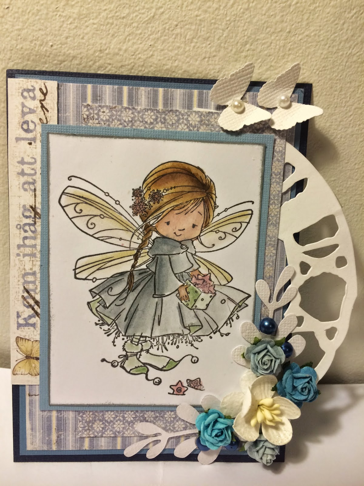 It's been a beatutiful spring day today and I have spent many hours in the garden. I also made this card with this sweet little dragon called Little peppermint puff, I think he is so cute.
